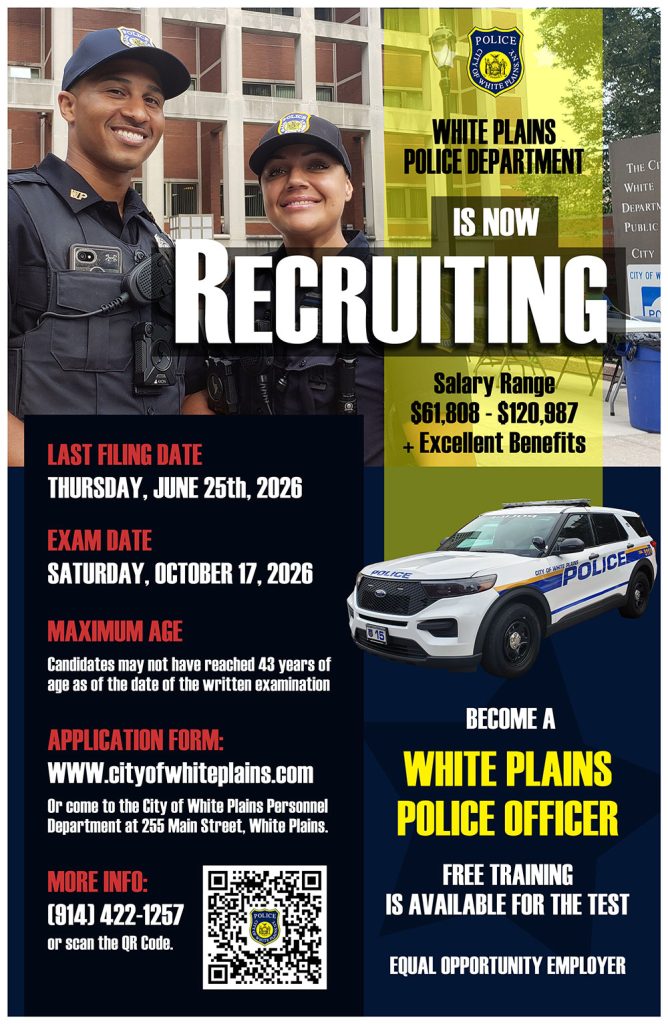 The next City of White Plains Police Officer exam will be held on Saturday, October 17th, 2026.